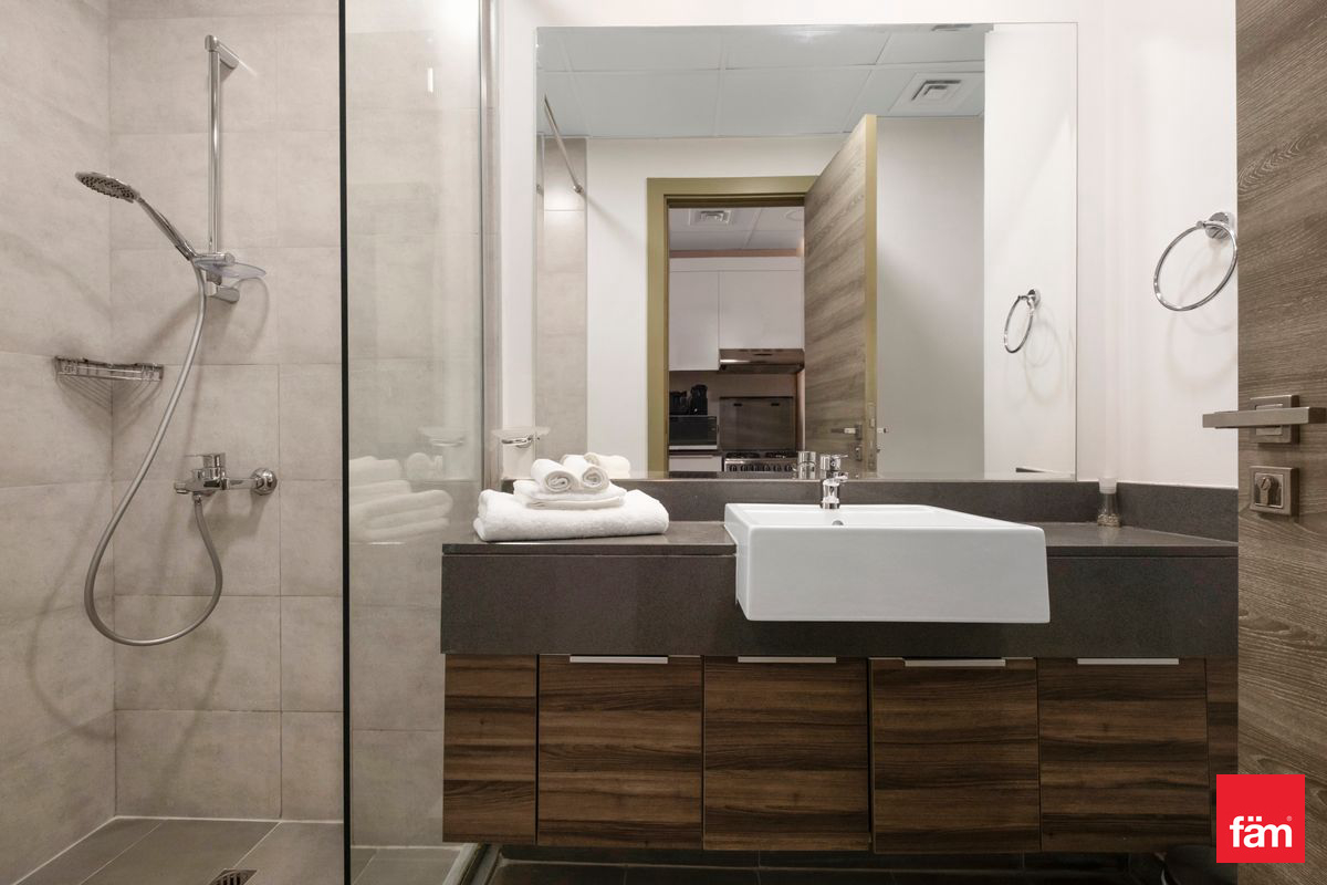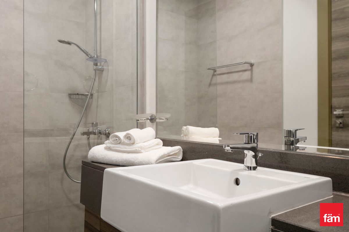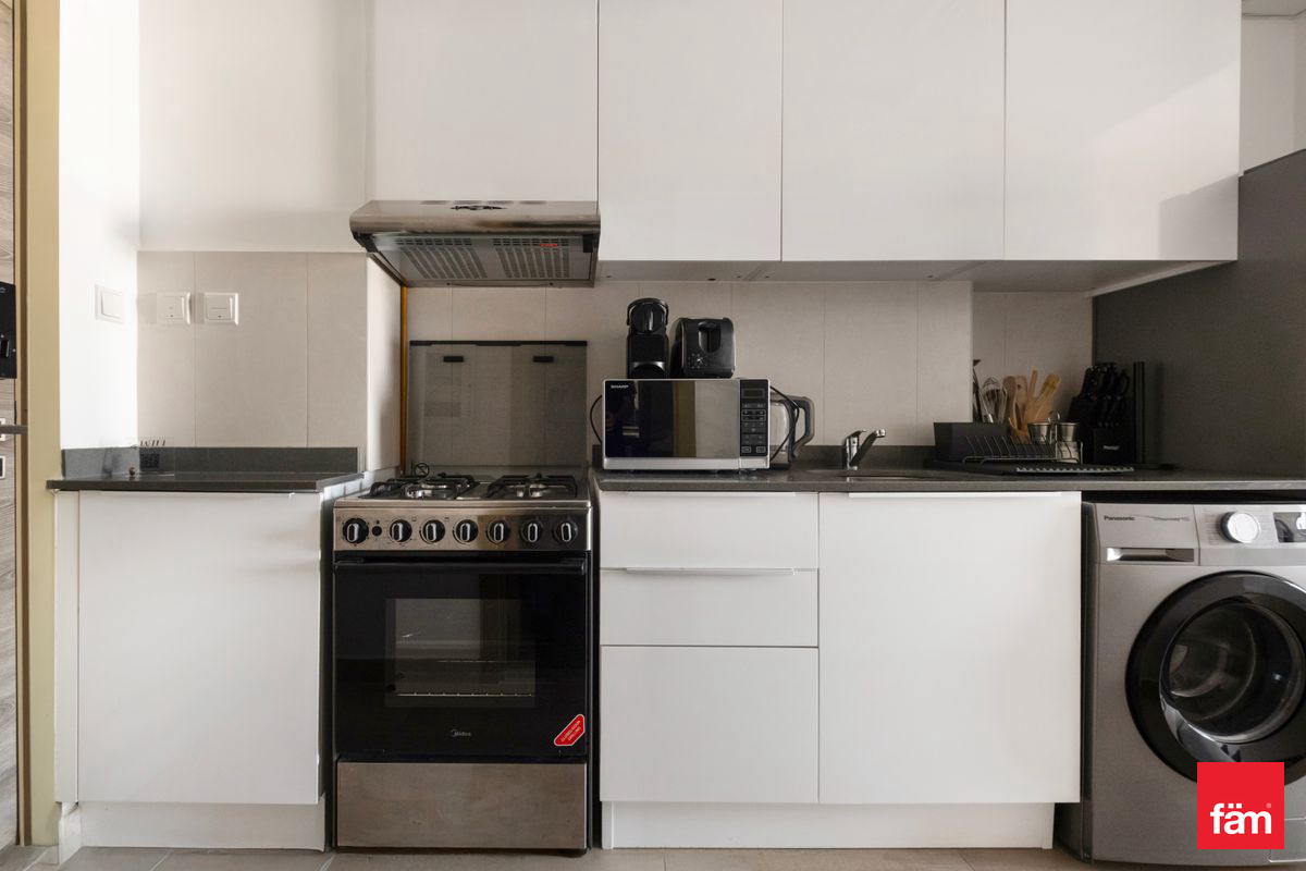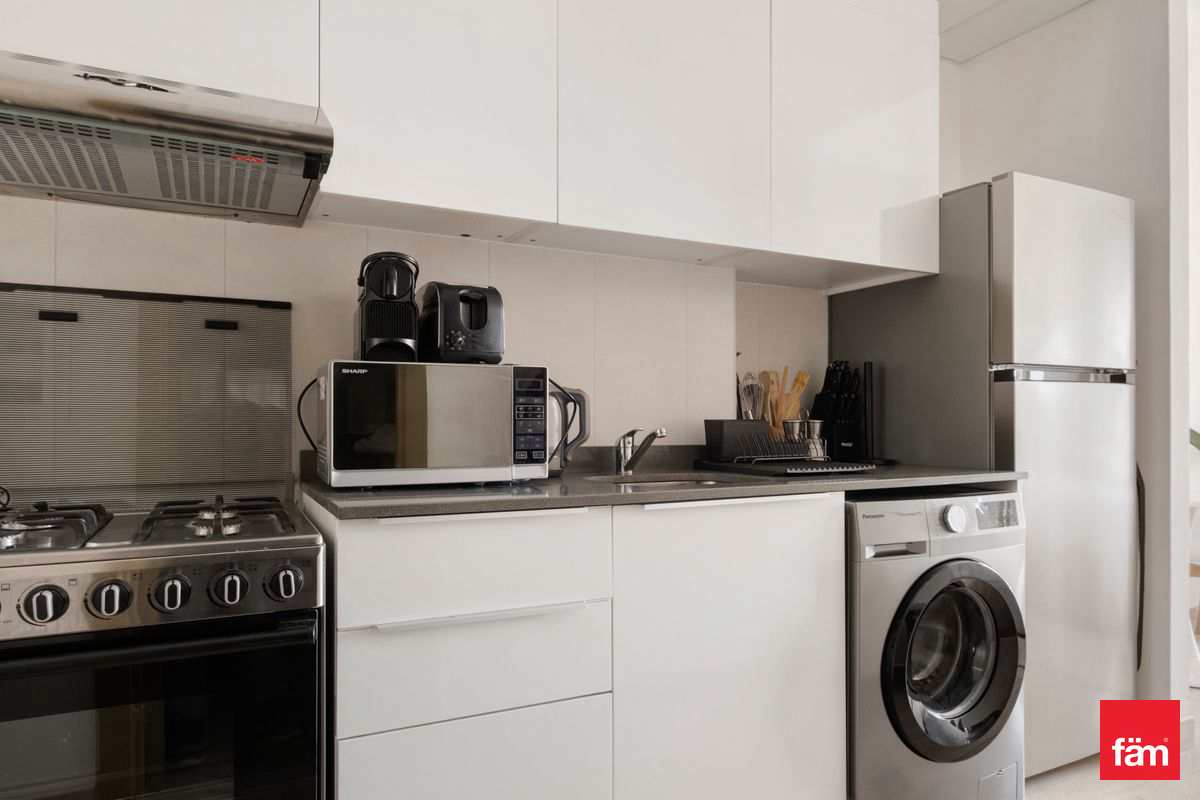 The modern open kitchen is fully equipped with high-quality appliances, sleek cabinetry, and ample storage space, while the bathroom is finished with stylish fittings and premium materials.