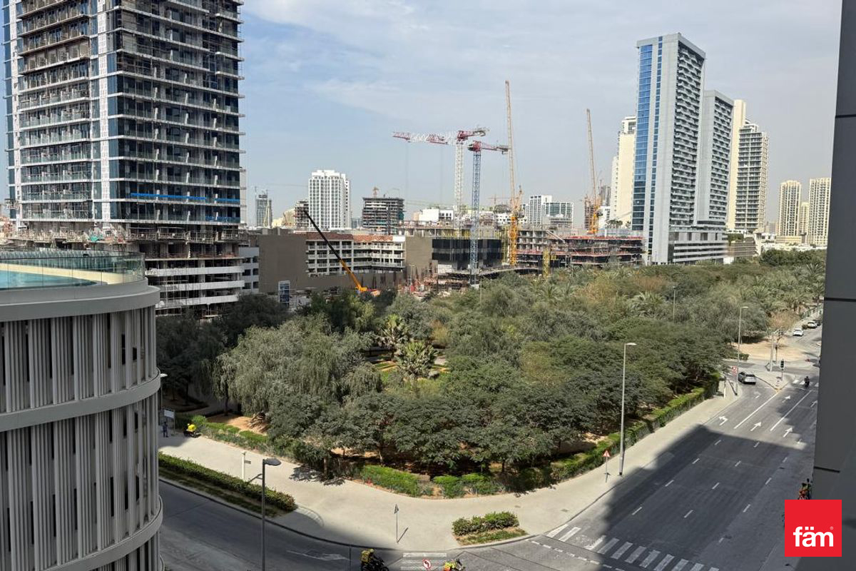 This bright apartment features a smart open layout, built-in wardrobes, a modern kitchen, and a pleasant community view.