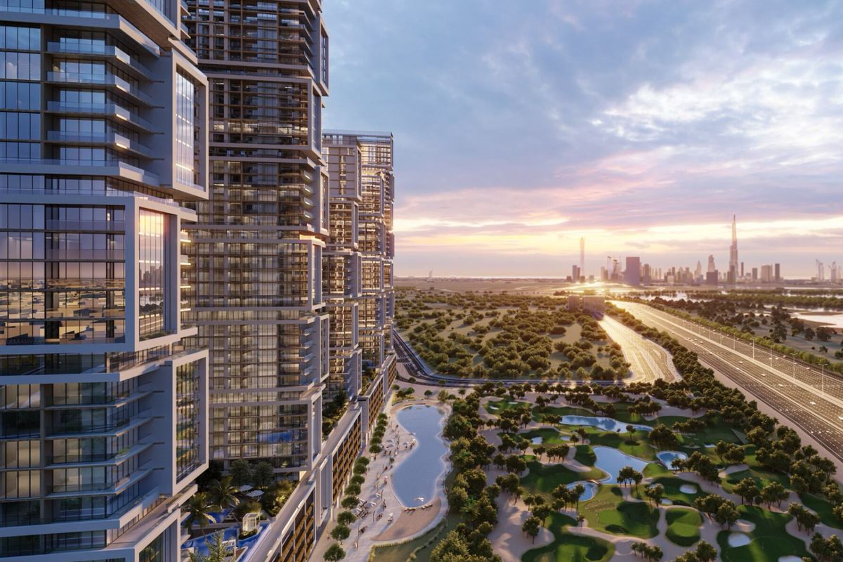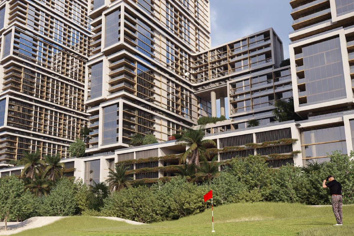 5 interlinked towers rising from 30 floors up to 65 with sky gardens and surrounded by a golf course overlooking,